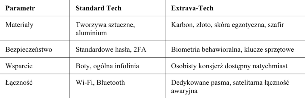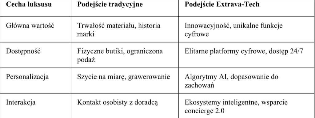 Poniższe zestawienie prezentuje kluczowe różnice między tradycyjnym postrzeganiem luksusu a nowoczesnym podejściem typu Extrava-Tech, które dominuje w obecnych strategiach rynkowych.