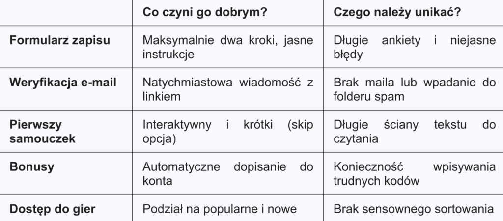 dłużej. Dobry onboarding to nie tylko ładne kolory i proste hasła, to realne narzędzia, które dają nam poczucie bezpieczeństwa i kompetencji. Wybierając miejsce do zabawy, zawsze zwracaj uwagę na to, jak jesteś traktowany jako nowicjusz – to najlepszy wskaźnik jakości całego serwisu.
